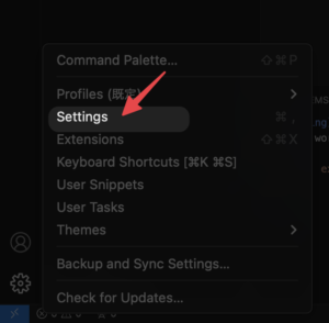 VS Codeの左下の歯車マークをクリックし、続いて Setting をクリックします。