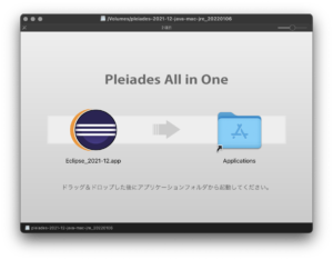 ダウンロードが完了したらダウンロードしたファイルをクリックし、ポップアップウィンドウでドラックアンドドロップしインストールを行います。