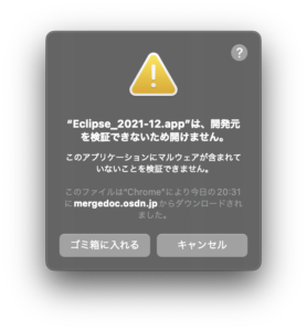 再度警告が出ますが今度は [開く] のボタンが選択可能なのでクリックすると問題なく Eclipse を起動することができると思います。