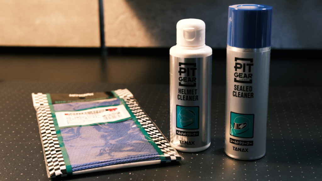 写真の右から シールドクリーナー、ヘルメットクリーナーです。