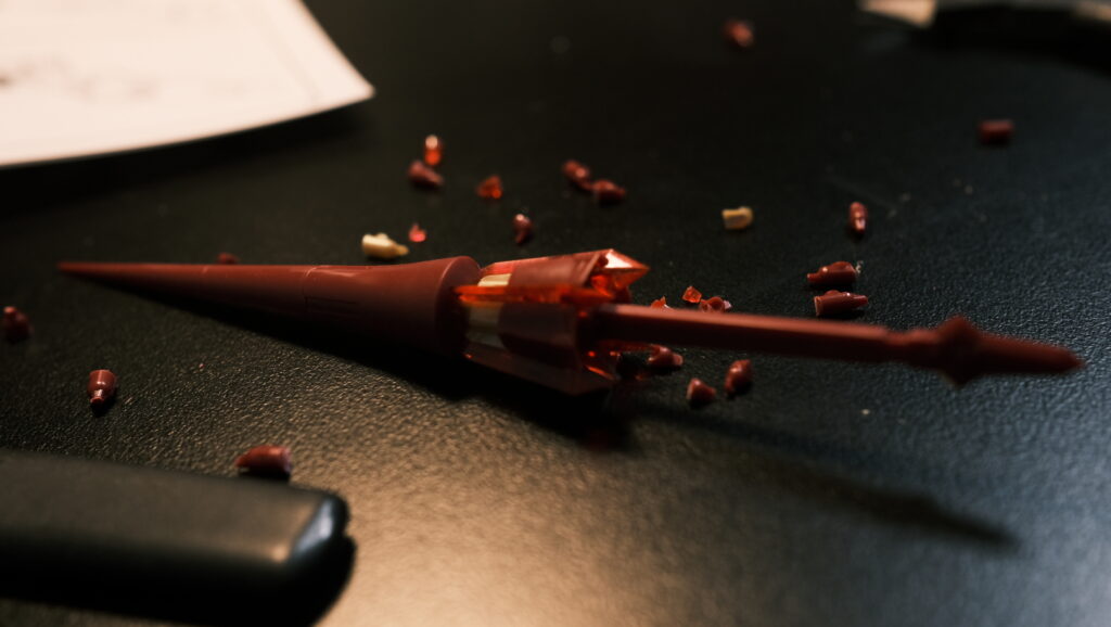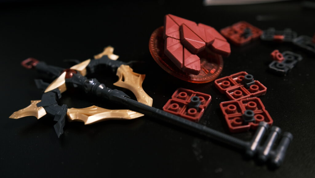 こういうパーツが多いプラモデルはだんだん最後の方に気力がなくなっていくというのが過去の経験からみえているのでメインとなる素体は後にとっておき、武器など周辺領域から組み立てるのが個人的なノウハウ。