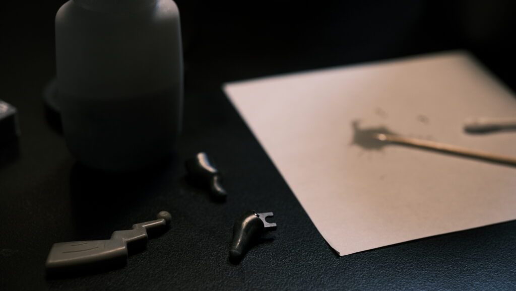 本体が黄色っぽいのに、グレーのカラーパテを使ってしまった結果、下地処理(サーフェイサー)の際に色が隠れず苦労しました。。
