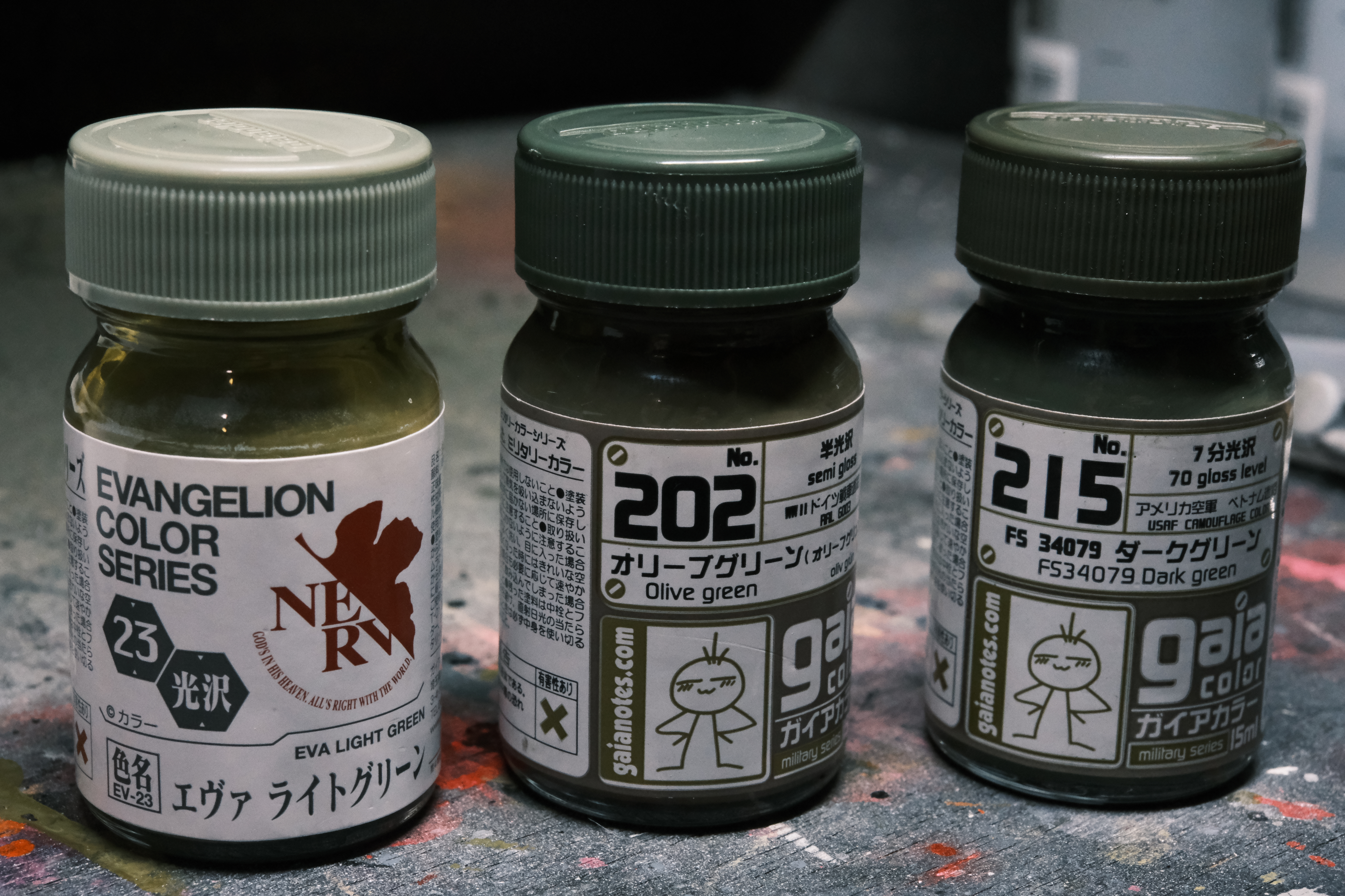 濃いグリーンの下地はGS-03 サーフェイサーエヴォ ブラックで塗装し、他はメカサフを使いました、
